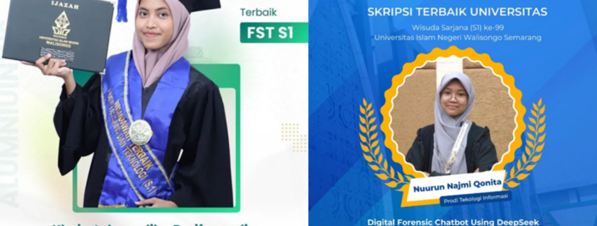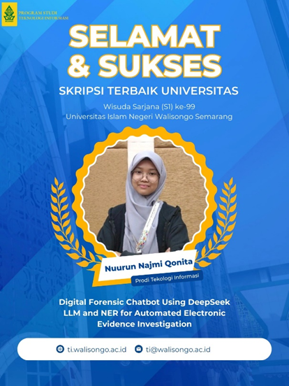 Selain itu, prestasi membanggakan juga diraih di tingkat universitas melalui penghargaan Skripsi Terbaik Universitas yang diberikan kepada Nuurun Najmi Qonita. Skripsi berjudul Digital Forensic Chatbot Using DeepSeek LLM and Named Entity Recognition (NER) for Automated Electronic Evidence Investigation tersebut menghadirkan inovasi pemanfaatan kecerdasan artifisial dan pemrosesan bahasa alami dalam mendukung proses investigasi barang bukti elektronik secara otomatis. Karya ini dinilai unggul karena mampu mengintegrasikan pendekatan riset mutakhir dengan kebutuhan praktis di bidang digital forensik.