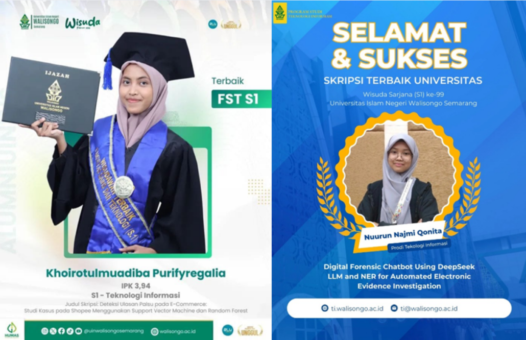 Pada wisuda kali ini, mahasiswa Prodi Teknologi Informasi berhasil meraih penghargaan strategis di tingkat fakultas dan universitas. Khoirotulmuadiba Purifyregalia dinobatkan sebagai Lulusan Terbaik Fakultas Sains dan Teknologi Program Sarjana (S1) dengan capaian Indeks Prestasi Kumulatif (IPK) 3,94. Prestasi tersebut diraih melalui skripsi berjudul Deteksi Ulasan Palsu pada E-Commerce: Studi Kasus pada Shopee Menggunakan Support Vector Machine dan Random Forest, yang mengkaji penerapan metode machine learning untuk mendeteksi ulasan palsu pada platform e-commerce. Karya ini dinilai memiliki ketepatan metodologi, relevansi isu, serta kontribusi aplikatif terhadap pengembangan teknologi informasi di ranah ekonomi digital.